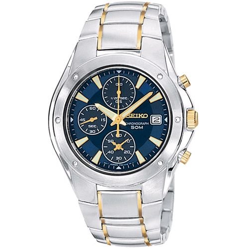 - Two-tone case; blue dial; date function; chronograph functions