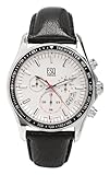 - Genuine black leather strap with secure buckle-clasp; date window at 4 o'clock; chronograph functions with 60-second, 30-minute, and 12-hour sub dials